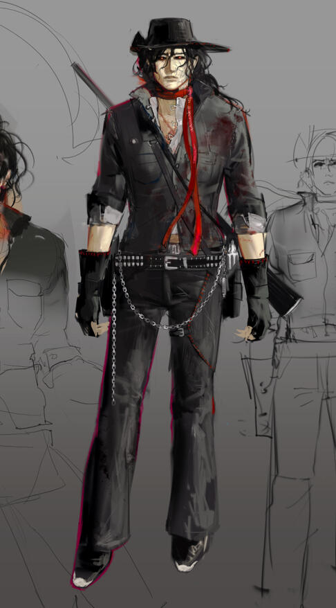 Three boys, as ragged as they come, huddled in the corner of the office. The one talking had his knees drawn up, a blood-soaked rag pressed against his face, eyes raised to the figure leaning in the doorway.She was wrapped in pale leather, buckled and fastened by black straps. Her sleeves ran long and dark, tufts of fur over the sniper gloves that exposed her taloned fingers. She had no eyebrows to speak of, and stranger more were the stretch marks that scarred her cheeks, slurring her speech that made the boy listen more intently. Over dirty brown curls she wore a hat so white it caught the lamplight in ways that hurt to look at. It sat low and casted a shadow over her eyes, not that the boy dared to look into them anyways – he wasn’t sure if he’d find anything human in them.“What’d he look like?” the figure asked, the smoke from the cigarette curled up in the air thick with dust and sweat.“It was dark, ma’am. Couldn’t see much. We was scared out of our minds. He shot Tommy, you know. We ran. I ran.” He winced, voice cracking. “Got me right here, too. Oh– greasy long hair, it was all over me when he cut me.” His hand shot as he touched the gash that stretched across his cheek, still raw, still wet with blood. The others nodded in silence.“And what were you boys doin’?” came the same, flat tone.“I swear, ma’am, just lookin’ at his horses. Didn’t know they was his. Honest.”“Just lookin’...” she raised the part of her face where her right brow should be. One hand clung on to her gunbelt with a clawed thumb. The boy’s voice trailed off into a mutter, and the other two stared down at the floor like they’d find something there to save them.“Pager,” the sheriff interrupted as he swung into the office. “I heard what happened.” He peered past Pager and studied the sullen group of boys. The eyes of a blond one lit up. “You’re her. The Pager woman. Strong one. Ma’am, you gonna catch this man? What he did to us–”“Like I said, I’ll see what I can do.” She took one last drag from the cigarette, then flicked it to the floor, grinding it out under her dusty heel. “And stay out of trouble,” she pointed at the boys. With that, she gave the sheriff a nod, and turned swiftly out into the dark.